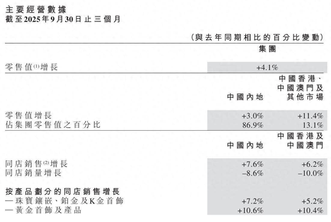 10月17日盘后,周大福(港股代码:01929)披露截至2025年9月30日止3个月未经审核主要经营数据,公司期内零售值同比增长4.1%,其中内地市场零售值同比增长3%,香港、澳门及其他市场零售值同比增长11.4%。